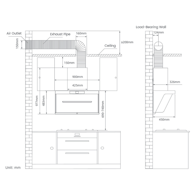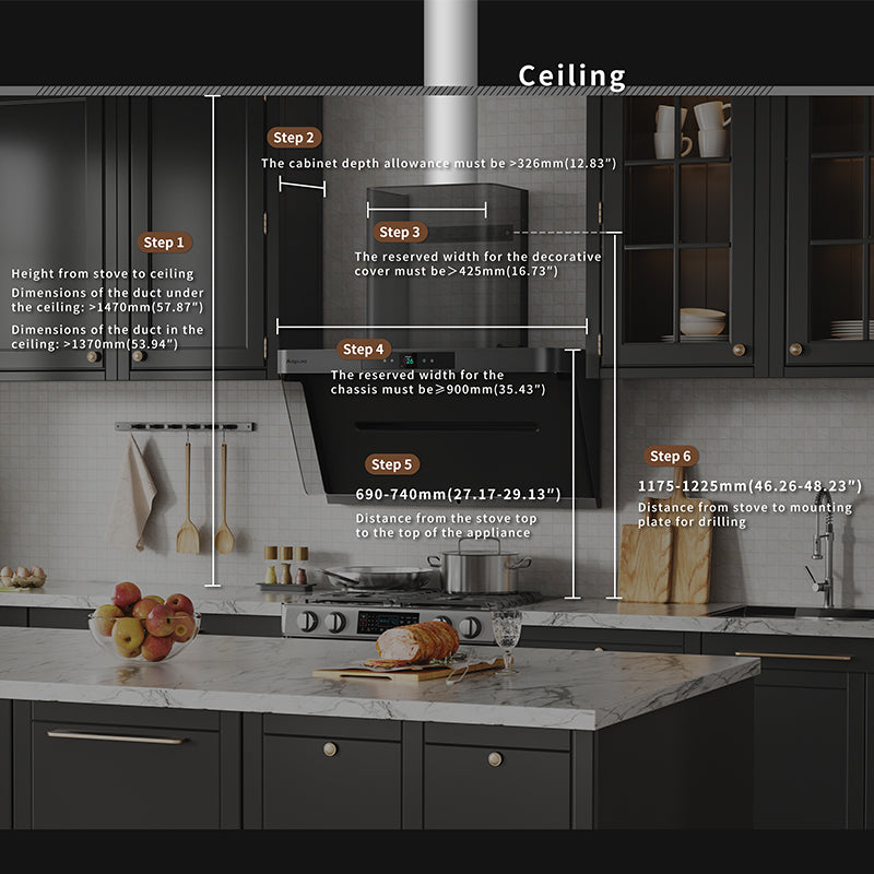 Recommended installation height: 690–740 mm (27–29”) measured from the cooktop surface to the hood bottom (control panel area).Minimum ceiling cavity height for vertical duct installation: 200 mm (7.87”).Clearance between the top of the hood and the ceiling should be at least 150 mm (5.91”).Cabinet opening dimensions: width ≥ 430 mm, depth ≥ 330 mm (recommended depth: 450 mm / 17.7 ”).Internal cabinet width should be no less than 425 mm (16.73”).Service access cutout on back panel: 430 mm (W) × 460 mm (H).