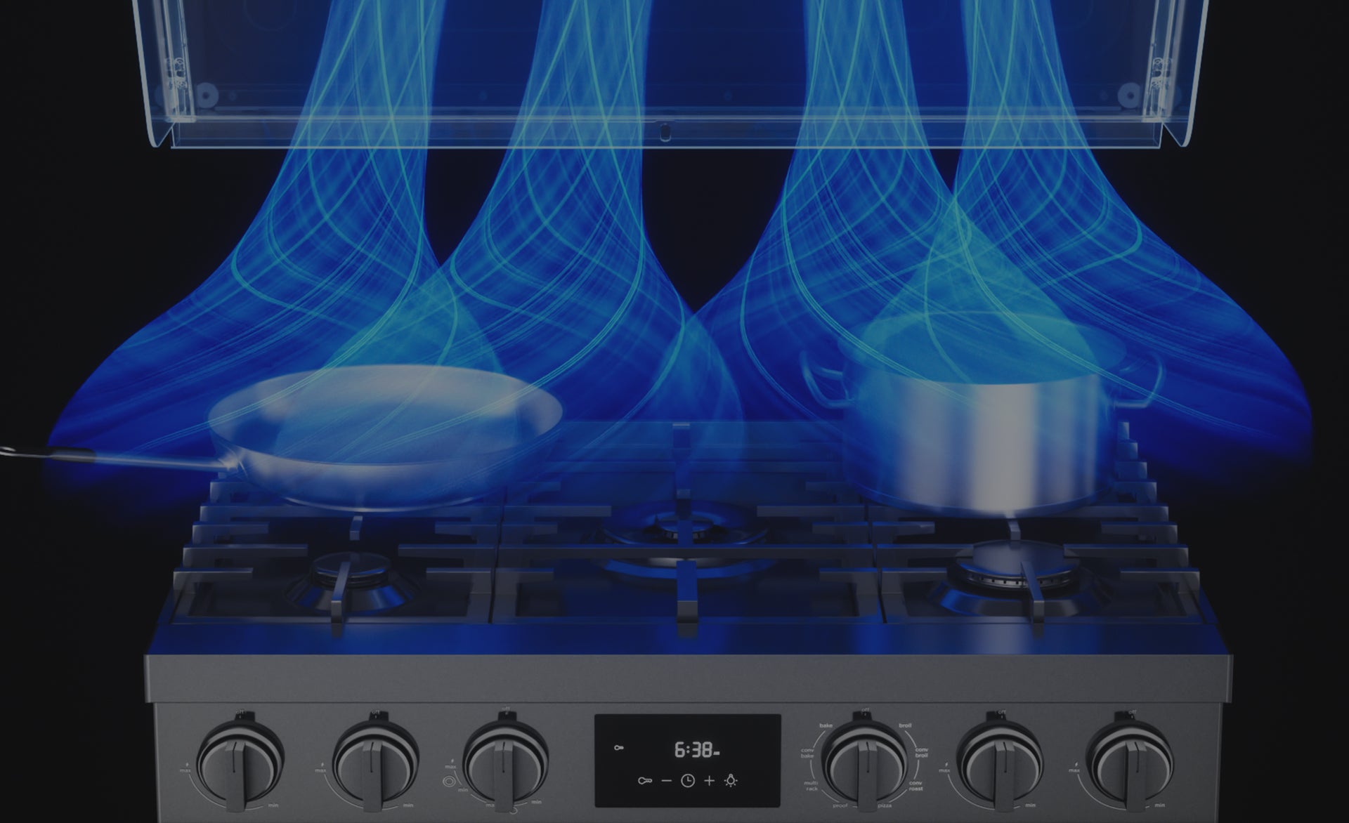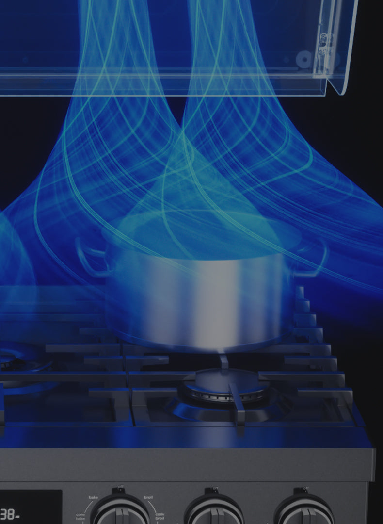 Patented IQV airflow forms four converging vortices to trap smoke, odor, and grease right at the stovetop, keeping your kitchen air clean and clear.